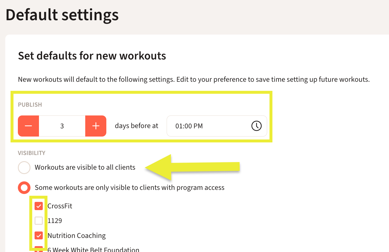 - Set defaults for new workouts : You can change the default time your workouts are published and the visibility of each workout by checking of which Programs or allowing all workouts.