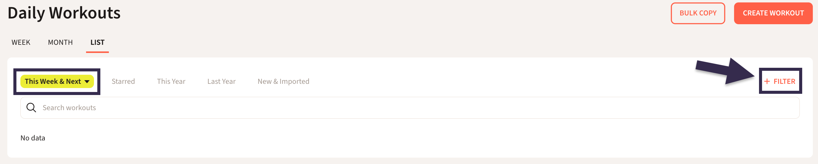 - In List, you can Search and Filter what Workouts you would like see by either clicking +Filter, or choosing the down arrow in the one of the default tabs at the top.