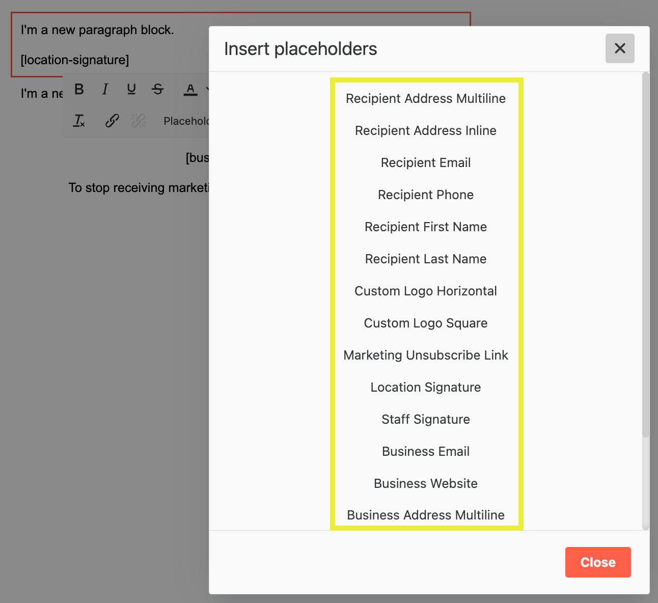 Note: Placeholders allow you to personalize your email by including Business or Recipient information.