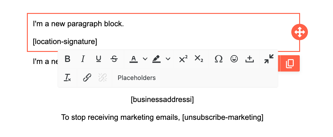 IMPORTANT: The Marketing Unsubscribe Link placeholder will build an unsubscribe link into your email, and exclude any users that have already unsubscribed. Not including this link will send the marketing email to all recipients even if they're unsubscribed.