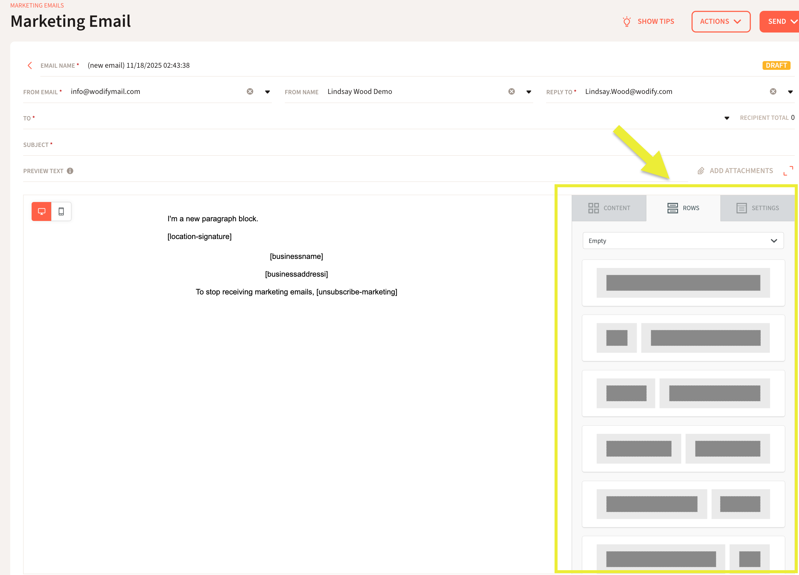 Rows: Use the "Row" tab to control the layout of your email. You can add rows to create different sections and arrange your content blocks.