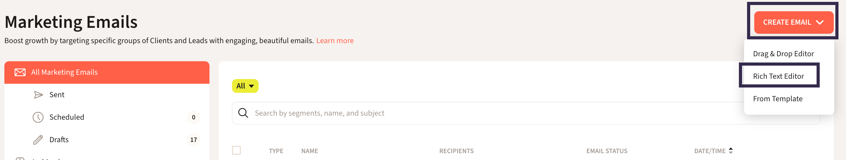 Go to Communication > Marketing Emails and select Create Email. Fill out required fields (From Name, Subject, Recipients, etc.) and use either the Drag & Drop Editor or Rich Text Editor to design your content.