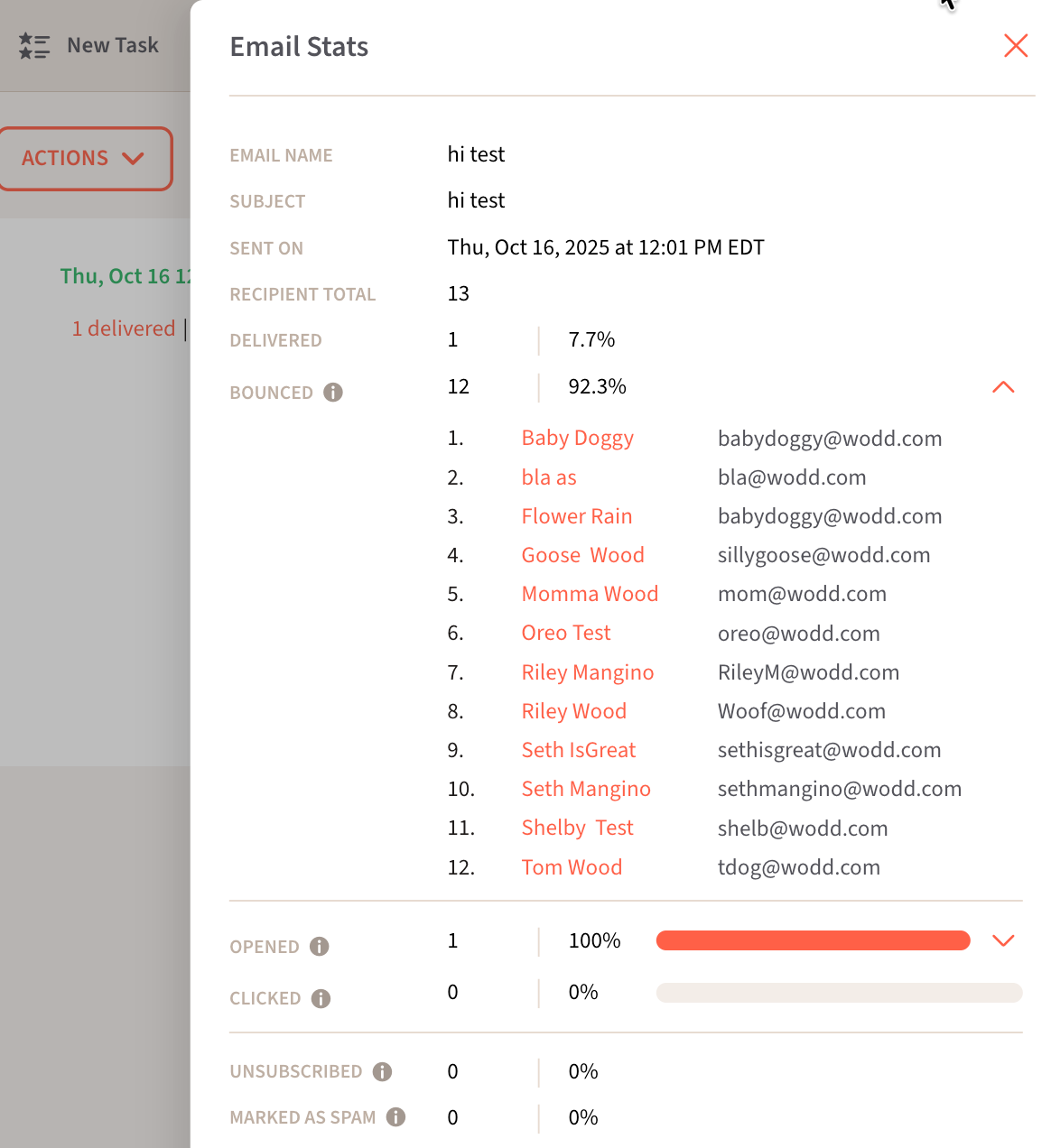 Open a delivered email and click the Delivered count to see open rate, click rate, bounce rate, unsubscribes, and spam reports.