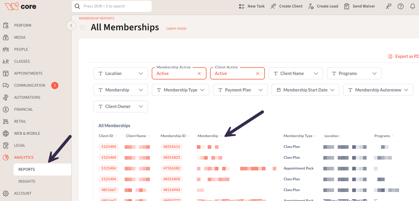 - Click into each client profile with a membership applied > Click into the Membership