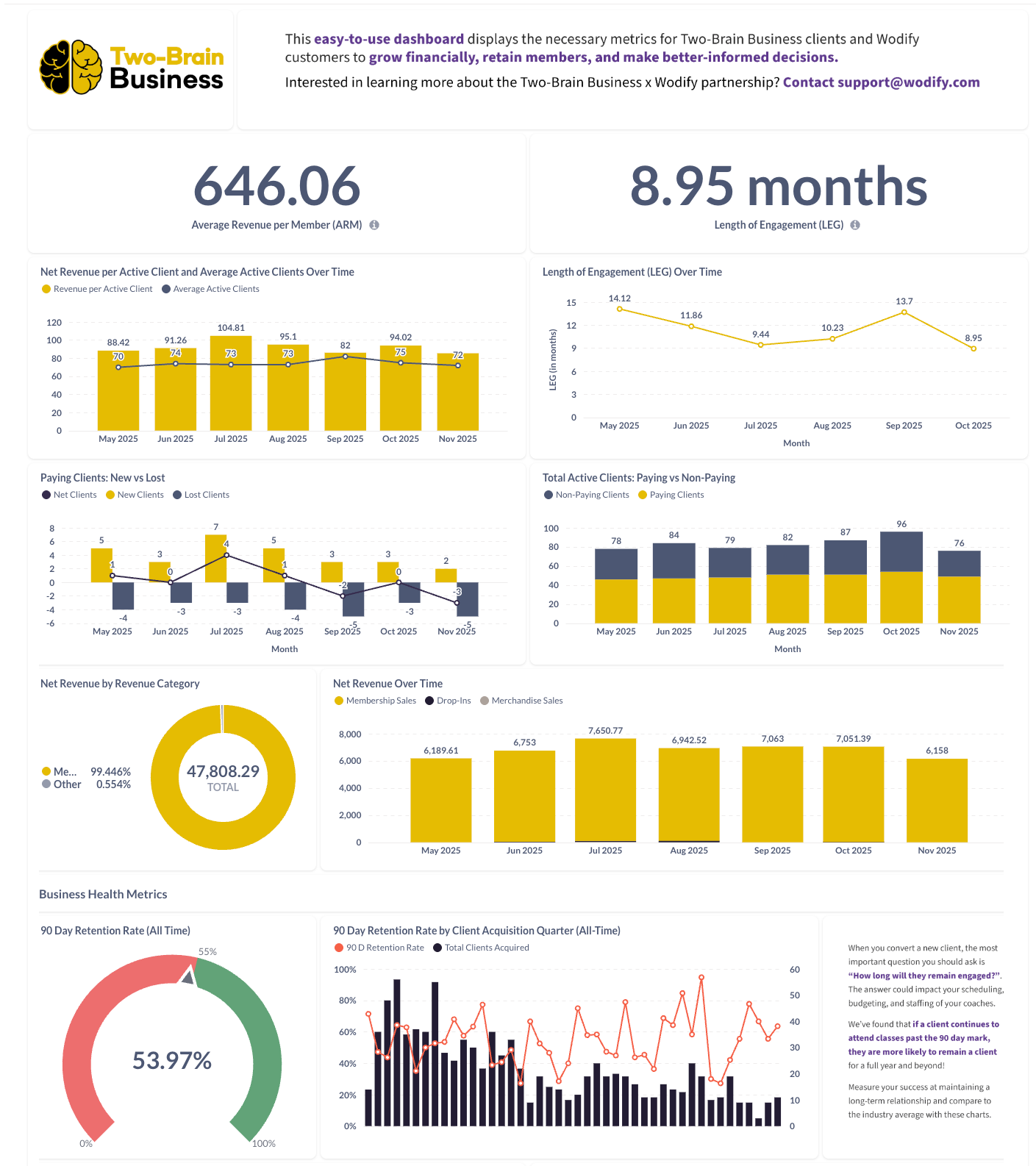 Business Insights is a data dashboard that consolidates financial, membership, and lead metrics to help gym owners make better decisions. It mirrors the KPIs recommended by Two-Brain, such as ARM, LEG, churn, and revenue.