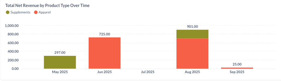 Total Net Revenue by Product Type over Time: Your total net revenue broken down by product type over time. You can create custom time ranges to see these results in different months.