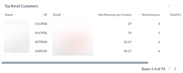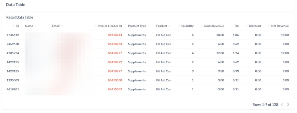 Top Retail Customers: Retail customers’ purchases are aggregated and sorted at the customer level. Each customer will appear once and will be associated with their total number of products, invoices, and net revenue summed. Please note that all sales from customers who do not have a client account are grouped together as a single customer.